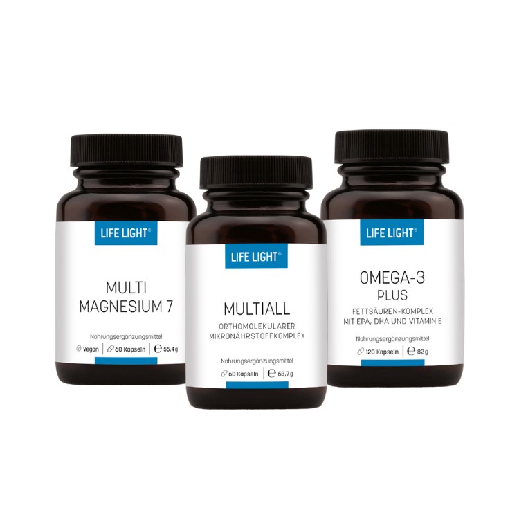 Im Einklang mit der Jahreszeit: Dein Power-Trio Omega 3 Plus – Ruhe & Klarheit im Kopf, Stärke im Herzen Hochwertiges Fischöl aus EPA- und DHA-reichem Kaltwasserfisch, kombiniert mit zellschützendem Vitamin E. Unterstützt Herzgesundheit, Konzentration und emotionale Balance – für mehr Ruhe, Fokus und innere Stärke, besonders in der dunklen Jahreszeit. Multi Magnesium 7 – Innere Ruhe & Kraft Sieben synergistische Magnesiumverbindungen unterstützen Muskeln, Nerven und Energiestoffwechsel auf mehreren Ebenen. Ideal bei Stress, Anspannung oder Müdigkeit – für mehr Gelassenheit und körperliche Leistungsfähigkeit. Multiall – Rundumversorgung für dein Immunsystem Umfassende Mikronährstoffformel mit Vitaminen, Mineralstoffen, Antioxidantien, Enzymen und Pflanzenextrakten. Unterstützt Immunfunktion, Zellschutz, Energieproduktion und Stoffwechsel – für ganzheitliche Vitalität, wenn dein Körper sie am meisten braucht. 3-in-1 Basisversorgung für Herbst & Winter Mit dem Life Light Herbst-Bundle bist du rundum versorgt: