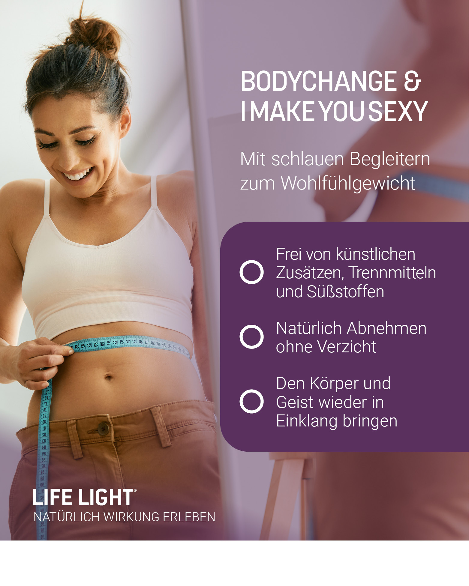 Um dir auch weiterhin einen fairen Preis für beste Qualität und Zusammensetzung der BodyChange-Produkte zu bieten, bot sich eine Partnerschaft förmlich an! Deine gewohnten Lieblings-Supplements von BodyChange und IMAKEYOUSEXY kannst du ab jetzt weiterhin ganz bequem über den LIFE LIGHT® Webshop bestellen – und dabei viele weitere Top-Produkte entdecken: Ob Vitamine, Calcium, pflanzliche Präparate oder Enzyme – bei LIFE LIGHT® profitierst du von über 30 Jahren Erfahrung und kannst dich auf beste Wirkstoffe und perfekt abgestimmte Formulierungen verlassen. Wie gewohnt: bequem und einfach direkt zu dir nach Hause geliefert!