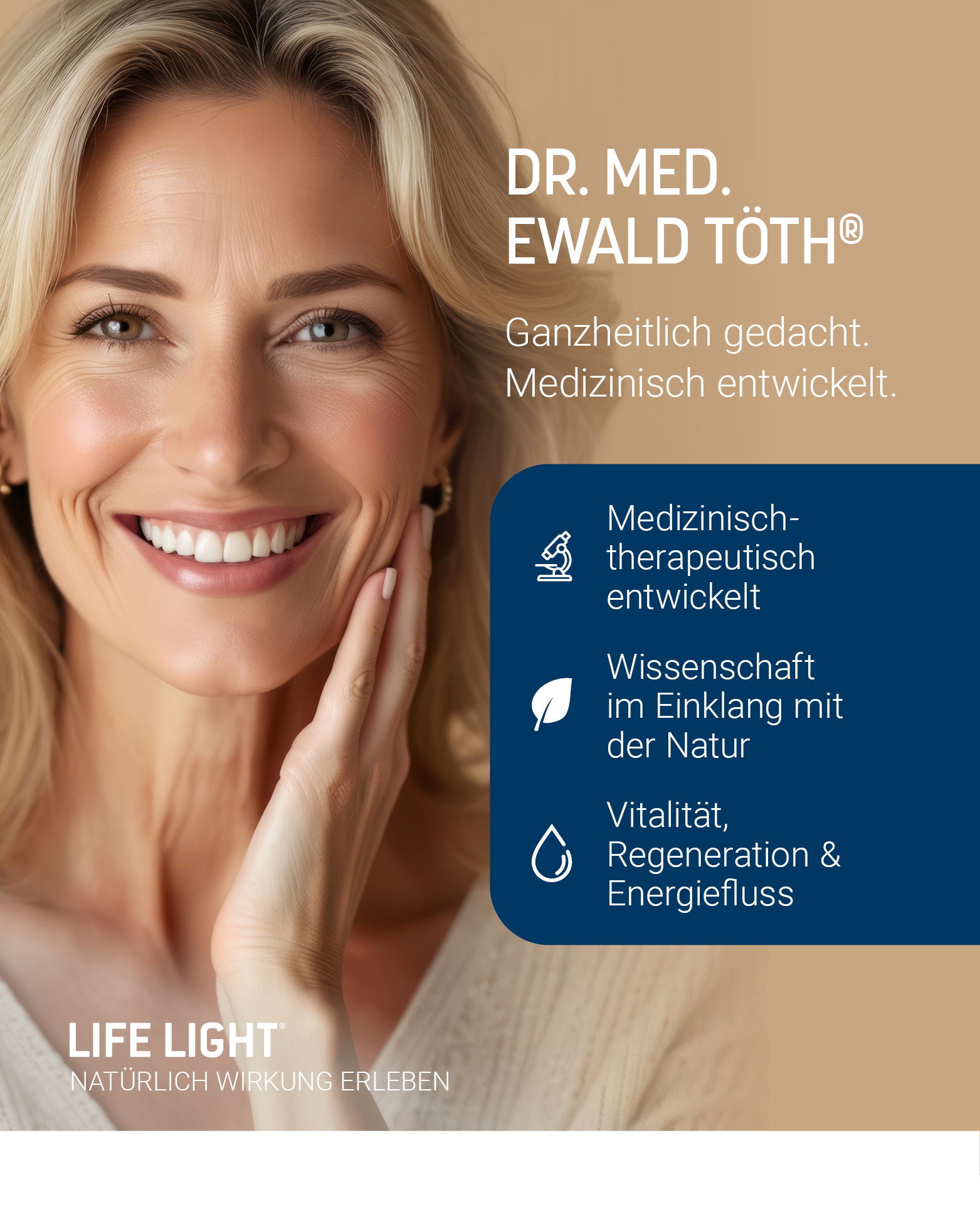 Die Dr. med. Ewald Töth® Produkte vereinen wissenschaftliche Erkenntnisse mit bewährtem Erfahrungswissen und setzen auf das patentierte Licht-Quanten-Verfahren. Dieses Verfahren ermöglicht es, die elektromagnetische Energie des Sonnenlichts auf ausgewählte Trägersubstanzen zu übertragen, wodurch die Produkte einzigartig sind.
